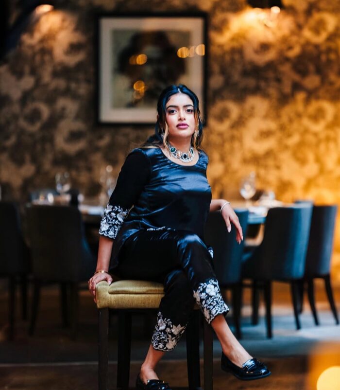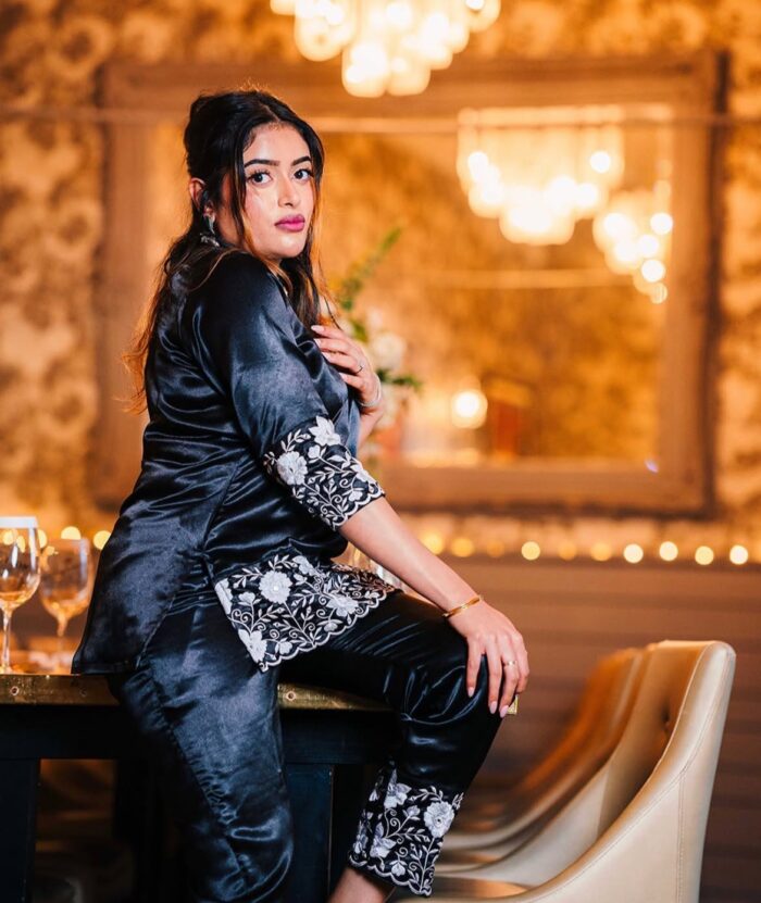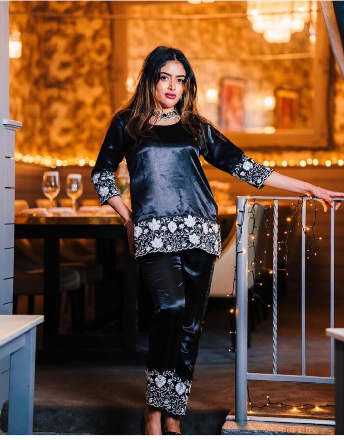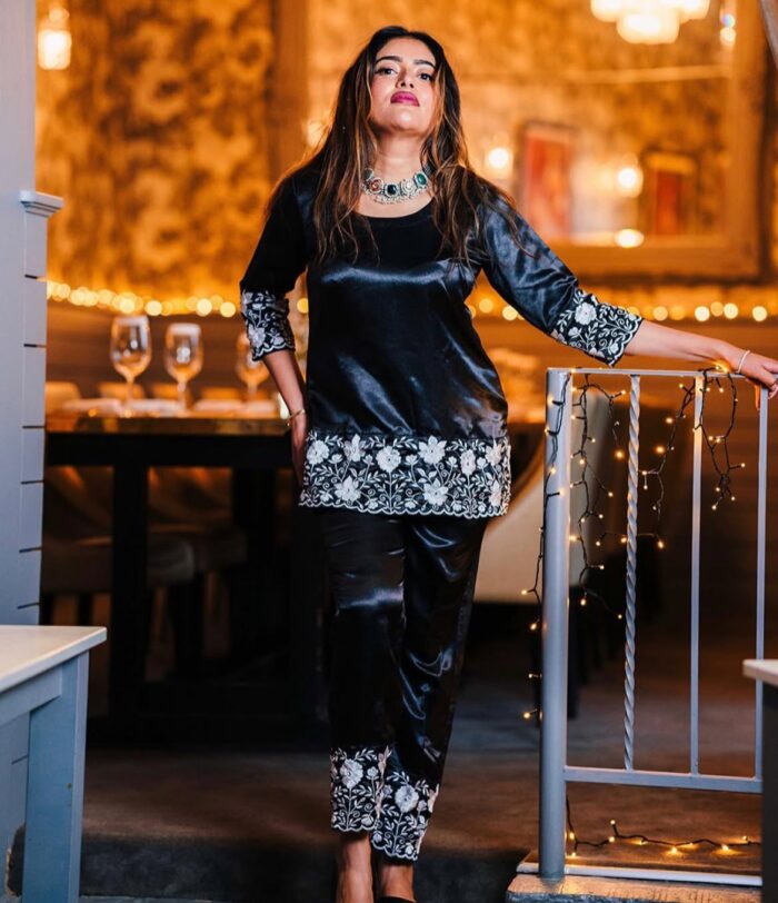 This is a beautiful satin cord set with hand embroidery. We can do this in any colour for you.  We will show you the fabric before Stitching. As each piece is custom stitched, please allow us three weeks to design stitch and deliver.