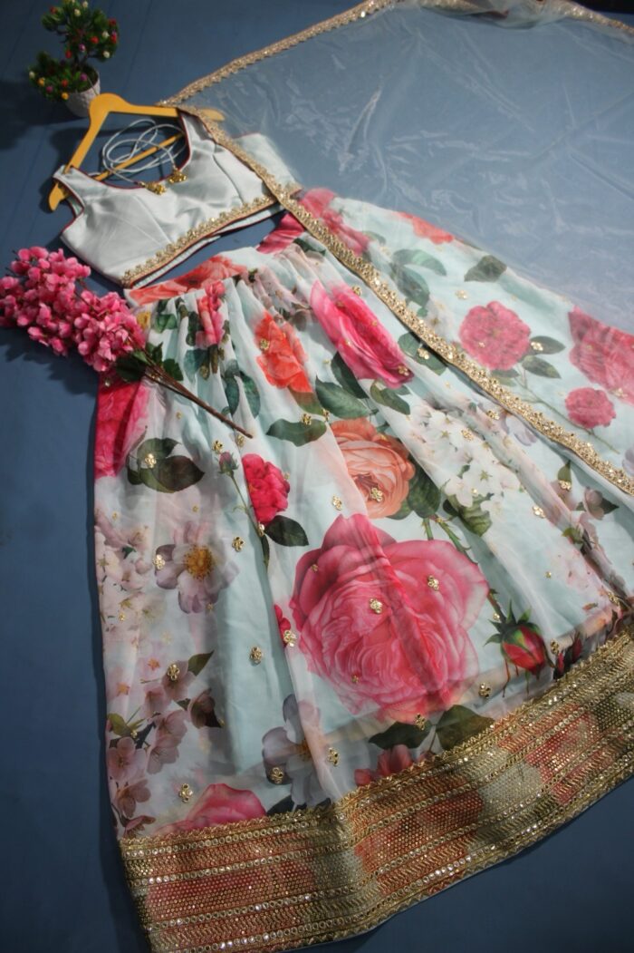 Gracefully designed with floral digital prints, zari, dori & sequin work – this organza lehenga set is a timeless festive favorite!