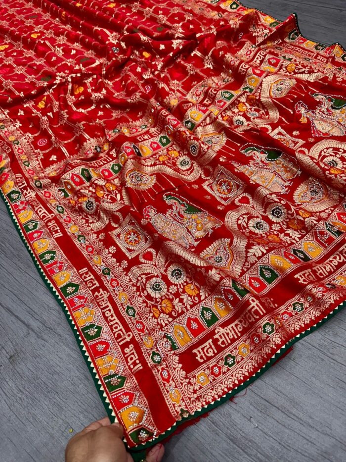 The saree features an intricate all-over flower bandhani design, which gives it a unique and classic look.