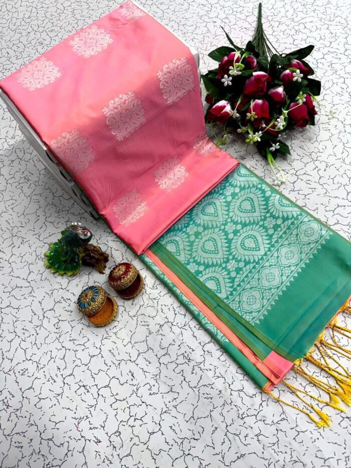 Pink and green silver zari arani soft silk saree